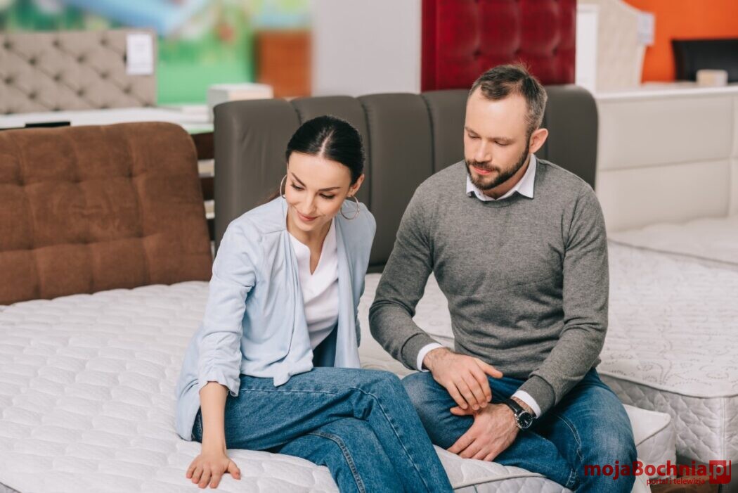 3. portrait of couple sitting on mattress while choosing goods together in furniture store