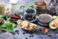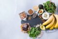 Healthy food nutrition dieting concept. Assortment of high magnesium sources. Banana chocolate spinach chard, avocado, buckwheat, sesame chia flax seeds, yogurt, nuts, beans oat. Copy space background