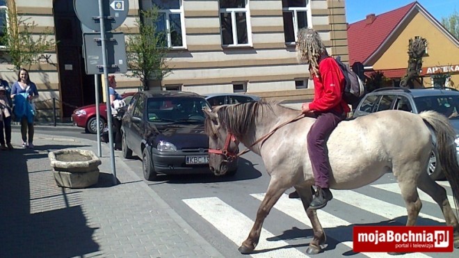 3. Mężczyzna przemierza na koniu łącznik przed Bazyliką św. Mikołaja, 26 IV 2012