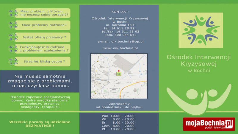 Osobom poszukującym pomocy i wsparcia w trudnych sytuacjach życiowych przypominamy, że od 2005 r. w Bochni działa Ośrodek Interwencji Kryzysowej (OIK), który jest budżetową jednostką organizacyjną powiatu bocheńskiego.