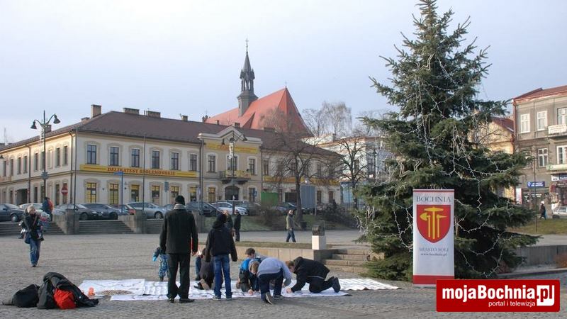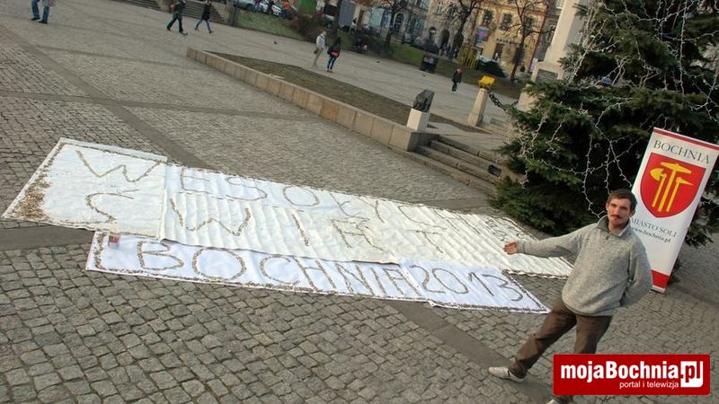 Paweł Mej, znany jako Bosy Biegacz z Baczkowa, po raz kolejny ułożył na Rynku w Bochni życzenia świąteczne z monet. Tym razem było ich ponad dwanaście tysięcy. Do układania zostali zaproszeni przypadkowi przechodnie, nie zabrakło również przedstawiciela władz Bochni, zastępcy burmistrza Tomasza Przybyło.