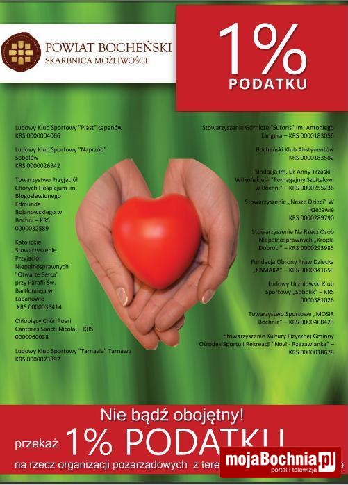 W tym roku, podobnie jak w latach ubiegłych Starostwo Powiatowe w Bochni zachęca mieszkańców Powiatu Bocheńskiego do przekazywania 1% swoich dochodów na rzecz Organizacji Pożytku Publicznego działających na terenie bocheńszczyzny.