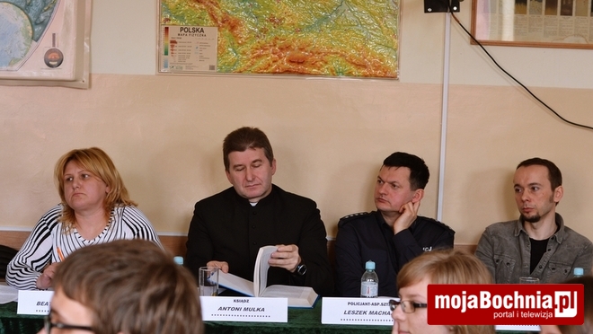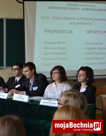 Wybrani klubowicze podzieleni na drużynę propozycji i opozycji podjęli polemikę, której celem było uświadomienie młodzieży wielowymiarowości tej sankcji, nie tylko aspektu prawnego, ale również psychologicznego, policyjnego, więziennego jak i religijnego. Dlatego zaproszeni eksperci w osobach: prawnik Beaty Głowackiej, wikariusza w Parafii Świętego Mikołaja w Bochni, prezesa Poradni Specjalistycznej i Telefonu Zaufania „Arka” ks. Antoniego Mulki, policjanta Zespołu do spraw Nieletnich i Patologii Wydziału Prewencji Komendy Powiatowej Policji w Bochni asp. szt. Leszka Machaja, psychologa więziennego Dawida Katolo, ustosunkowali się do poruszanego problemu, równocześnie odpowiadając na pytania młodzieży.