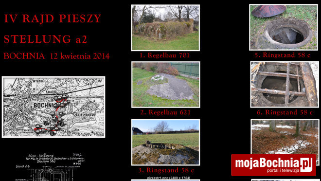 Umocnienia te wchodziły w skład całej linii Stellung a2, której część przechodziła właśnie przez Bochnię. Podczas rajdu postaramy się dotrzeć do wszystkich obiektów znajdujących się w tej części miasta. Zaczynamy na ul. Krzyżaki przy schronie Regelbau 701, następnie Regelbau 621 i dalej już schrony bojowe typu Ringstand 58 c, znajdujące się w rejonie ul. Krzyżaki. Kolejne miejsca to linie okopów w rejonie ul. Myśliwskiej. Dalej już kolejne obiekty Ringstand 58 c oraz Kochbunker znajdujące się w rejonie ul. Myśliwskiej. Kończymy na Podedworzu. Po zwiedzeniu miejsc lokalizacji kilku schronów typu Ringstand 58 c, dochodzimy do schronu Regelbau 701 przy którym planujemy zakończenie rajdu. Przy schronie tym będzie czas na wspólny odpoczynek oraz posiłek – mówią organizatorzy.