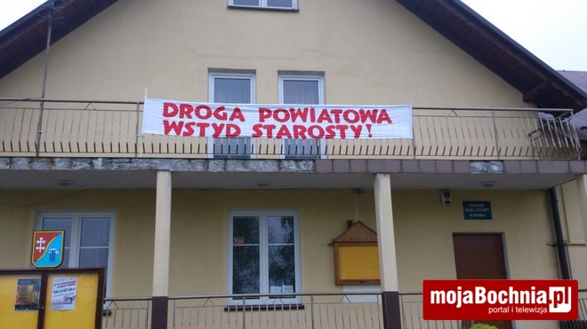 Na budynku domu ludowego w Siedlcu zawisł transparent z napisem „Droga powiatowa – wstyd starosty!”. Inicjatywa jego zawieszenia należy do wójta gminy Bochnia. Jerzy Lysy chce, aby mieszkańcy mieli świadomość, kto odpowiada za fatalny stan techniczny tego odcinka.