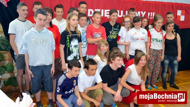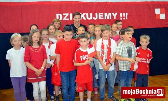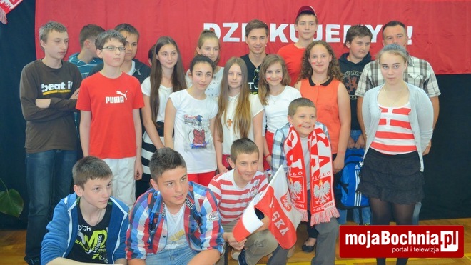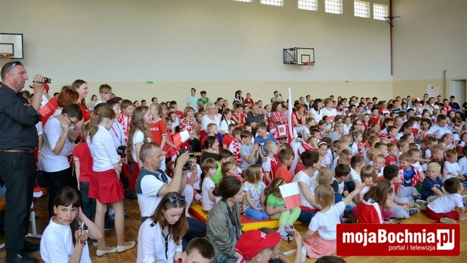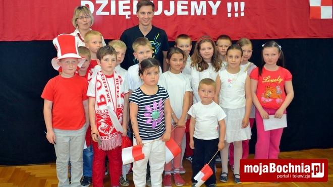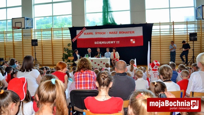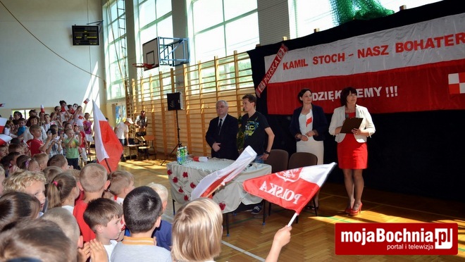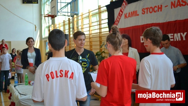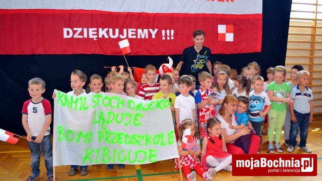Już od rana wszyscy z niecierpliwością czekali na spotkanie z Mistrzem. Szkolna sala gimnastyczna zamieniła się w sportową biało-czerwoną arenę. Każdy starał się godnie przygotować na spotkanie z tak wyjątkowym gościem, dlatego dominowały biało-czerwone stroje i makijaże. Całości dopełniały szaliki i chorągiewki w polskich barwach narodowych. Panu Kamilowi zgotowano w Królówce powitanie godne Mistrza. Kiedy tylko pojawił się na sali zewsząd rozległy się gromkie brawa, entuzjastyczne okrzyki, którym nie było końca i owacje na stojąco. W powietrzu zafalowało „morze” biało-czerwonych chorągiewek, gdyż na to niecodzienne spotkanie przybyło wielu absolwentów szkoły, mieszkańców Królówki, a także okolicznych miejscowości.