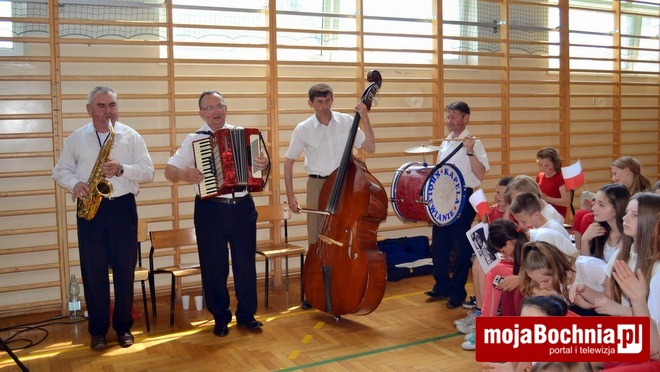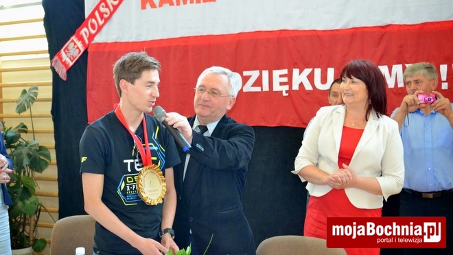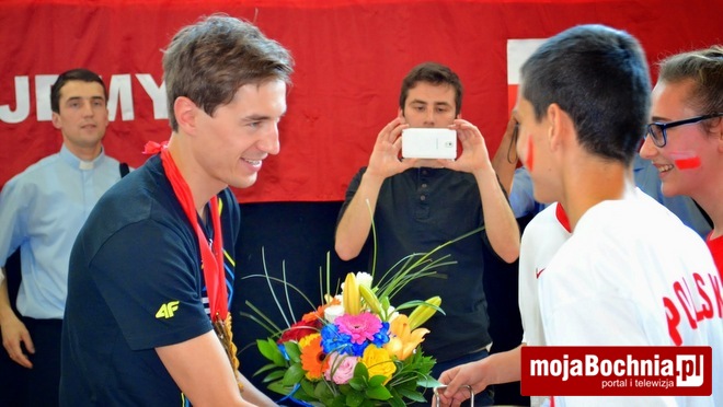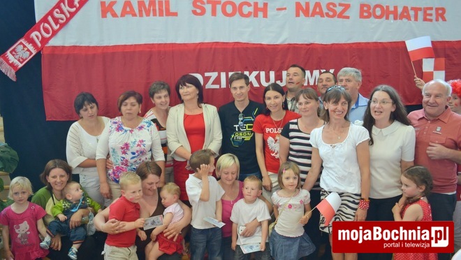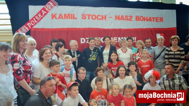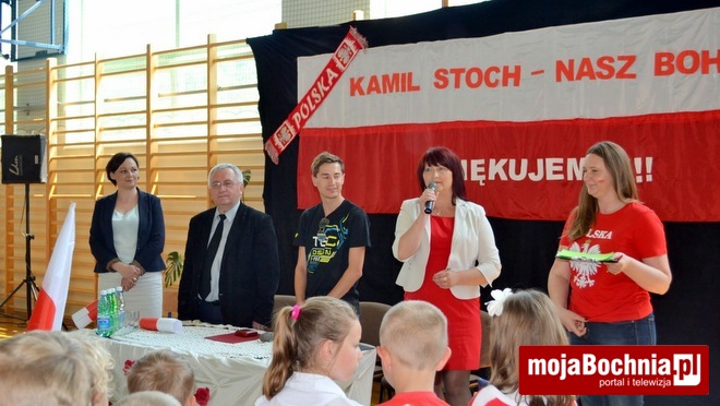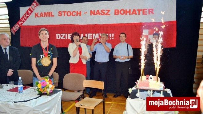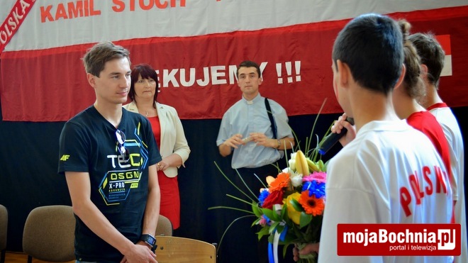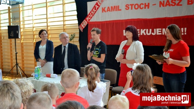 Do tak radosnego powitania dołączyła się kapela „Królewianie” – pod kierunkiem p. Albina Kiełtyki, której nie mogło zabraknąć w tym historycznym dniu dla szkoły i miejscowości. Dla Mistrza zaśpiewał też szkolny chór „Królewskie Słowiki”, który pod kierunkiem p. K. Adamczyk przygotował przyśpiewki ułożone specjalnie na tę okazję. Podczas oficjalnego powitania Burmistrz Nowego Wiśnicza mgr inż. Stanisław Gaworczyk, wręczył Kamilowi Stochowi List Gratulacyjny oraz pamiątkowy medal autorstwa prof. Czesława Dźwigaja.