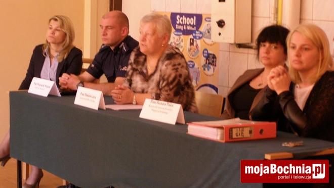 Po niej wystąpił Wojciech Więcek z Zespołu ds. Nieletnich, który opowiedział z jakimi problemami najczęściej spotyka się odwiedzając szkoły mu podlegające. Po nim pedagog Paulina Okulicka przedstawiła zebranej młodzieży jakie można radzić sobie z agresją. W swoim wystąpieniu wskazała, że bardzo ważna w tym wieku jest reakcja grupy rówieśniczej na złe zachowanie i właściwa reakcja tzw. Wzorowych uczniów, którzy niestety często udają, że nie reagują tłumacząc, że to nie ich sprawa. Po oficjalnych wystąpieniach odbyły się zajęcia warsztatowe dla uczniów poprowadzone przez Annę Dziedzic, podczas uczniowie opracowali propozycje ulotek jak należy zachowywać się podczas przerwy w szkole, na wycieczkach i dyskotekach szkolnych.
