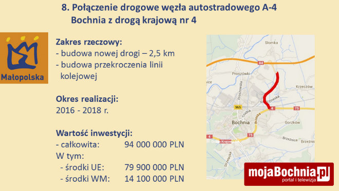 Zarząd Województwa Małopolskiego podjął decyzję o wpisaniu 19 inwestycji na listę realizacyjną i zabezpieczeniu środków na ich realizację w Wieloletniej prognozie Finansowej. Chodzi o inwestycje, które będę finansowane z funduszy europejskich. Jedną z tych inwestycji jest niezwykle potrzeba dla gospodarki Ziemi Bocheńskiej budowa łącznika węzła autostradowego z drogą krajową nr 94.