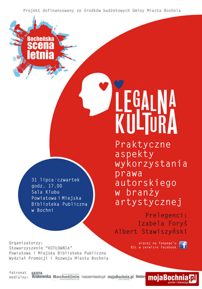 Warsztat edukacyjny, który odbędzie się pod koniec lipca br. w bocheńskiej bibliotece, skierowany jest do miejscowych muzyków, artystów, a także przedstawicieli lokalnego samorządu, instytucji kultury oraz stowarzyszeń. Uczestnicy poznają najważniejsze zagadnienia dotyczące praw autorskich i własności intelektualnej.