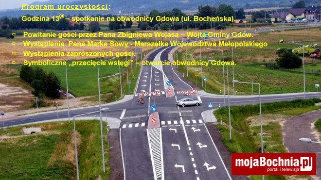 Spotkanie odbędzie się w najbliższą niedzielę (3 sierpnia) o godz. 13.00 na początku obwodnicy (skrzyżowanie z ul. Bocheńską – DW 967). Symbolicznego przecięcia wstęgi dokonają marszałek Marek Sowa oraz wójt Gminy Gdów Zbigniew Wojas. Udział w uroczystości zapowiedziała również wicepremier Elżbieta Bieńkowska.