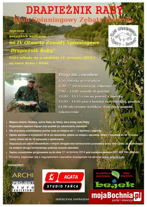 W najbliższą niedzielę na Rabie i Wiśle w rejonie Bochni odbędą się IV Otwarte Zawody Spinningowe po hasłem „Drapieżnik Raby”. Organizatorem imprezy jest Klub Spinningowy Zębaty Bochnia.