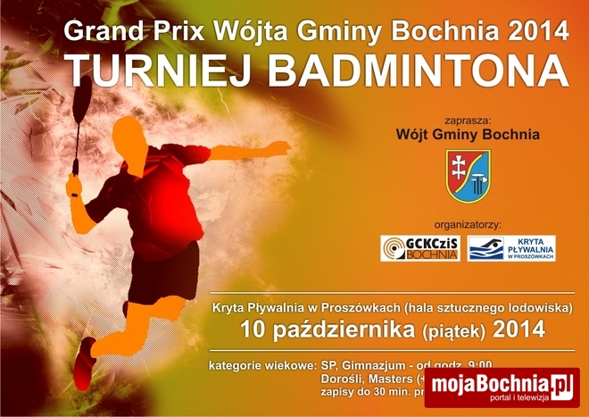 W piątek, 10 października, w hali sztucznego lodowiska przy Krytej Pływalni w Proszówkach odbędzie się kolejny Turniej Badmintona o Grand Prix Wójta Gminy Bochnia.