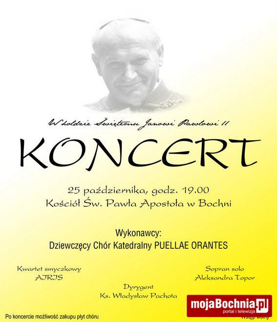 W sobotę 25 października w kościele św. Pawła Apostoła w Bochni odbędzie się koncert, dedykowany świętemu papieżowi z Polski. „W hołdzie św. Janowi Pawłowi II” wystąpią tarnowski chór dziewczęcy „Puellae Orantes” oraz Airis Quartet, pod batutą ks. Władysława Pachoty.