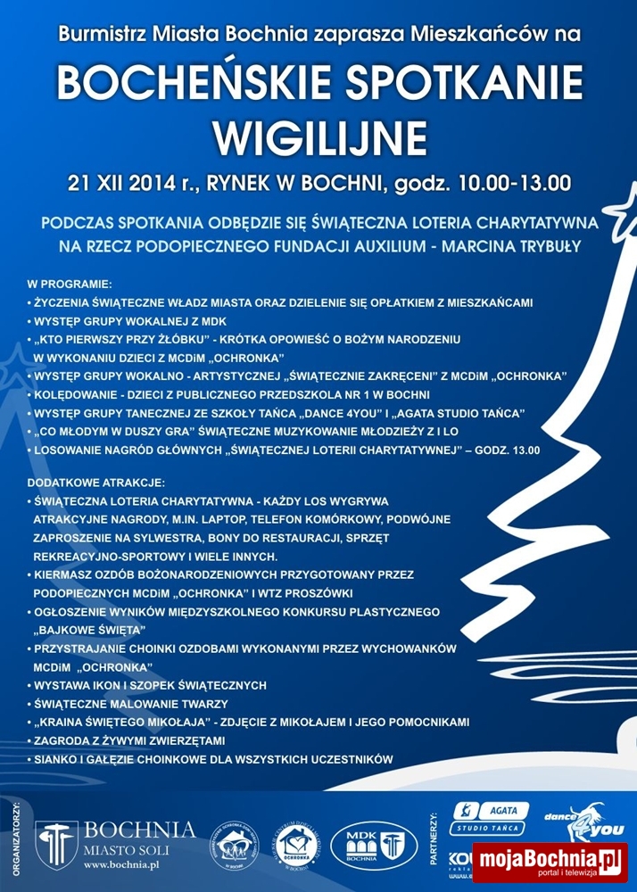 Burmistrz Miasta Bochnia zaprasza mieszkańców na Bocheńskie Spotkanie Wigilijne, które odbędzie się na bocheńskim Rynku w niedzielę 21 grudnia w godzinach 10.00 – 13.30.