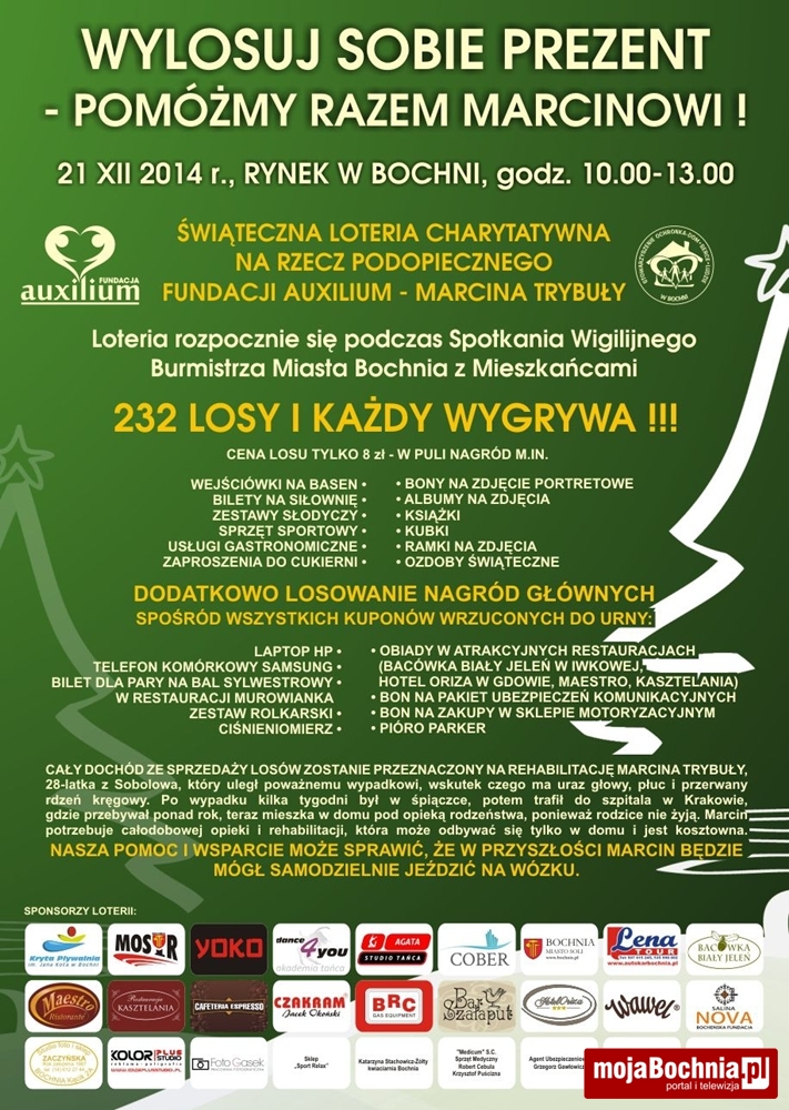 – świąteczna loteria charytatywna, z której całkowity dochód przeznaczony zostanie na pomoc, podopiecznemu Fundacji Auxilium, Marcinowi Trybale. Każdy los wygrywa, atrakcyjne nagrody, m.in. laptop, telefon komórkowy, podwójne zaproszenie na Sylwestra, bony do restauracji, sprzęt rekreacyjno-sportowy i wiele innych.