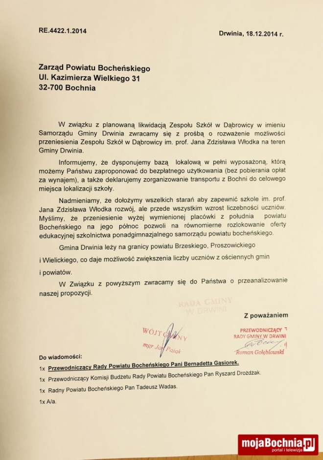 Władze gminy Drwinia proponują powiatowi przyjęcie na swój teren Zespołu Szkół z Dąbrowicy. „Dołożymy wszelkich starań aby zapewnić szkole im. prof. Jana Zdzisława Włodka rozwój, ale przede wszystkim wzrost liczebności uczniów” – czytamy w piśmie