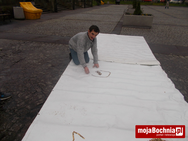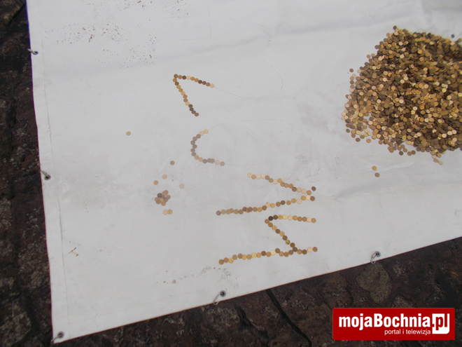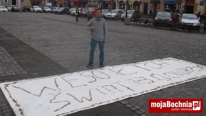 Jak co roku w przeddzień Bożego Narodzenia Paweł Mej układa na płycie Rynku życzenia świąteczne. Używa do tego monet jednogroszowych. W piątek pomagało mu w tym wiele osób, m.in. Tomasz Przybyło, zastępca burmistrza Bochni.