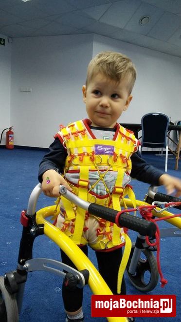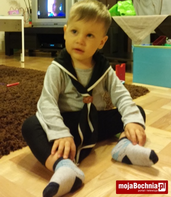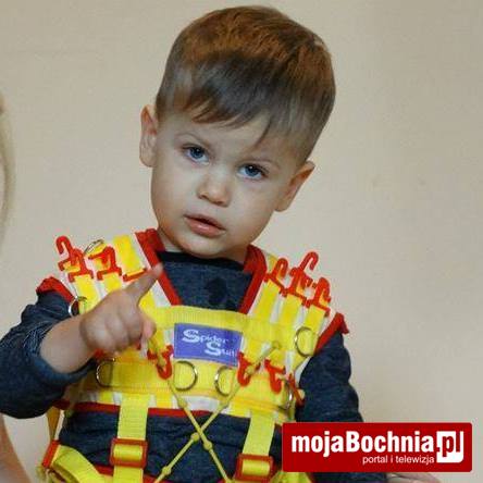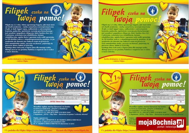 Filipek ma 2,5 roczku. W wyniku urazu okołoporodowego urodził się w ciężkiej zamartwicy, bez oznak życia, z zerową ilością punktów w skali Apgar. W wyniku reanimacji jego serduszko zaczęło bić, nie oddychał jednak samodzielnie i nie miał żadnego odruchu noworodkowego. W USD w Krakowie – Prokocimiu został wprowadzony w stan śpiączki farmakologicznej i poddany hipotermii. Dzielnie walczył z sepsą, drgawkami, ślinotokiem, brakiem odruchu ssania i połykania. W wyniku niedotlenienia i niedokrwienia w jego mózgu zaszły istotne zmiany. Ma opóźnienie rozwoju psychoruchowego, padaczkę, wiotkość krtani. Od 3 miesiąca życia jest intensywnie rehabilitowany. Mimo, że po urodzeniu nie dawano mu żadnych szans najpierw na przeżycie, potem ze względu na jego stan i rozległość zmian w mózgu, na uzyskanie jakiekolwiek sprawności, na dzień dzisiejszy Filipek zaczyna raczkować, pojawiają się pierwsze słowa. Ma dobry kontakt z otoczeniem, rozumie wszystko, co się do niego mówi. Udało się nam zejść z sondy i Filipek ładnie je łyżeczką, obecnie uczy się żucia i gryzienia. To wszystko, co u zdrowych dzieci pojawia się w sposób naturalny u Filipka musi być długo i mozolnie wyrabiane i utrwalane. Dzięki pomocy i wsparciu wielu ludzi udało się nam być już na 6 intensywnych turnusach rehabilitacyjnych i rozpocząć terapie korekcji tkanek miękkich u ukraińskiego lekarza. Obecnie Filipek jest na etapie nauki chodzenia, ale do pełnej sprawności jeszcze daleka droga.
