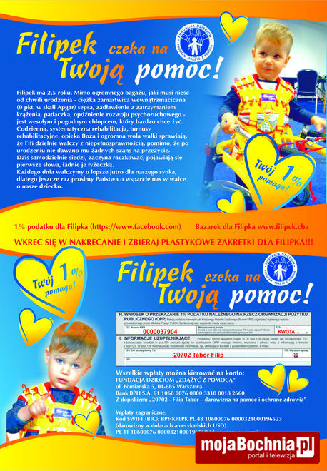 Rozpoczął się kolejny okres rozliczeniowy, wypełniając swoje zeznania podatkowe mogą Państwo przekazać 1%, przez co w naszym odczuciu pomóc na 100%. Piszemy tak dlatego, że ta forma pomocy jest dla nas najważniejsza, a każda nawet najmniejsza wpłata niezwykle cenna. Chorych dzieci jest bardzo dużo, organizacji i stowarzyszeń również, każdy sam musi podjąć decyzję dla kogo przekaże swój 1%. Dlaczego macie wybrać naszego Filipka? To wspaniały i radosny chłopiec, który codziennie ciężko pracuje, żeby polepszyć swój stan. Encefalopatia niedotleniowo – niedokrwienna upośledziła wiele funkcji w jego organizmie, ale najbardziej narząd ruchu. Z drugiej strony to mała mądrala, która potrafi upomnieć się o swoje ulubione traktorki. Ważne jest również to, że cały czas dokumentujemy sposób, w jaki wydatkujemy uzyskane dzięki Wam środki, możecie sami przekonać się o tym, że cały czas szukamy sposobu na walkę z chorobą Fifka i nigdy się nie poddamy. Potrzeb jest wiele: specjalistyczny sprzęt, turnusy, rehabilitacja ruchowa, lekarstwa, mikropolaryzacja mózgu, zabiegi w komorze hiperbarycznej, komórki macierzyste… Jeżeli chcecie i możecie nam pomóc prosimy przekażcie swój 1%, namówcie rodzinę, znajomych…