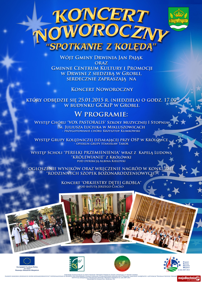 Wójt Gminy Drwinia Jan Pająk oraz Gminne Centrum Kultury i Promocji w Drwini z siedzibą w Grobli zapraszają na Koncert Noworoczny. Odbędzie się on w niedzielę 25 stycznia w Grobli.