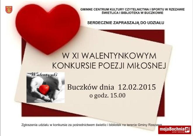 Gminne Centrum Kultury, Czytelnictwa i Sportu w Rzezawie – Świetlica i biblioteka w Buczkowie zapraszają do udziału w XI Walentynkowym Konkursie Poezji Miłosnej. Odbędzie się on 12 lutego w Buczkowie.