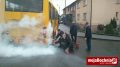 W chwili gdy autobus skręcił na ulicę Karosek z komory silnika buchnął ogień, a autobus się zatrzymał. Policjanci widząc co się dzieje, natychmiast zabezpieczyli miejsce zdarzenia a komendant Mariusz Dymura za pomocą gaśnicy z pojazdu służbowego zaczął gasić pożar. Po chwili do akcji gaszenia dołączył również kierowca autobusu.