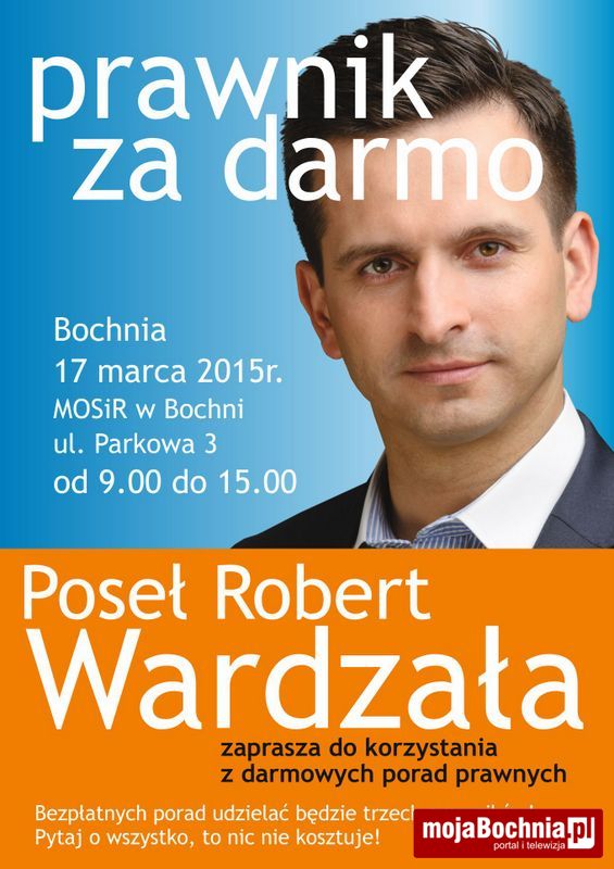 Prawnicy będą przyjmować zainteresowanych Prawnicy zapraszają mieszkańców Bochni i okolic z różnymi problemami – mówi inicjator akcji, poseł Robert Wardzała. Przypomnijmy, akcja „Prawnik za darmo” jest prowadzona już piąty rok. Odbywa się w Tarnowie oraz w miastach regionu – w Brzesku, Bochni, Dąbrowie Tarnowskiej i Tuchowie.