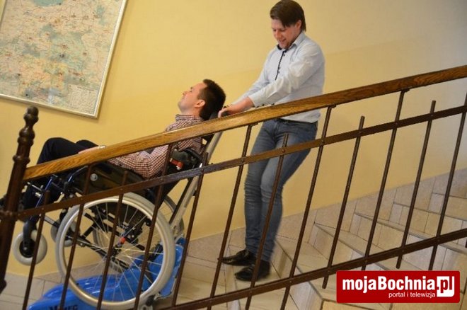 W urzędzie istnieją biura niedostępne bądź trudno dostępne dla osób poruszających się na wózkach inwalidzkich. Dlatego też po zaalarmowaniu pracownika specjalnie przeszkolonego osoba niepełnosprawna może przy pomocy schodołazu dotrzeć do konkretnego miejsca w urzędzie. Oczywiście istnieje też rozwiązanie alternatywne jakim jest możliwość zejścia pracownika merytorycznego do Punktu Obsługi Mieszkańca (od ul. Kazimierza) czy też do Punktu Obsługi Telefonicznej (od strony ul. Różanej) – wyjaśnia Katarzyna Kępa-Hamuda z biura prasowego w bocheńskim Starostwie.
