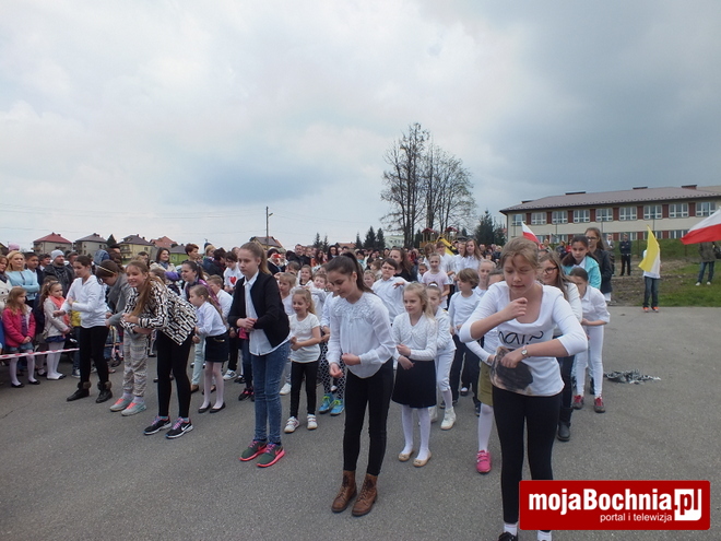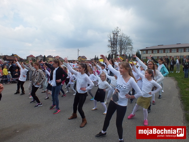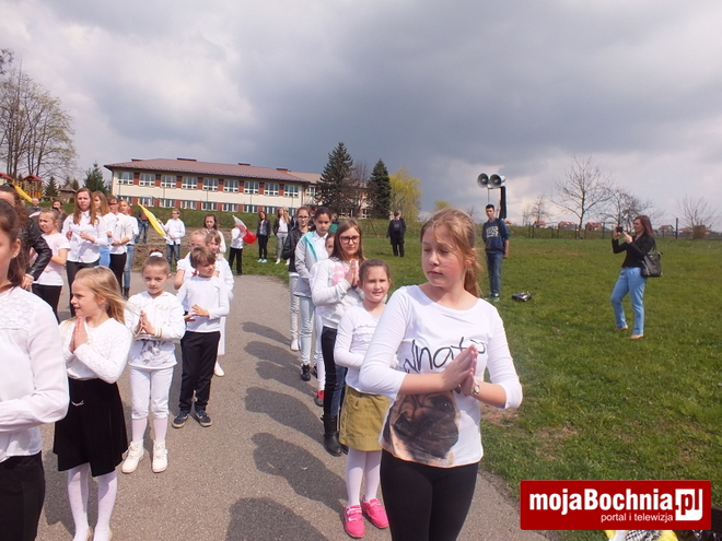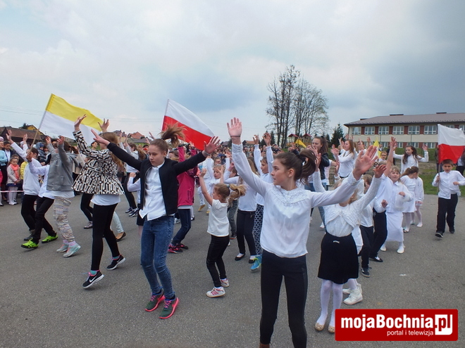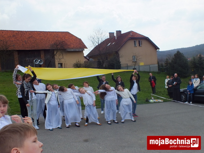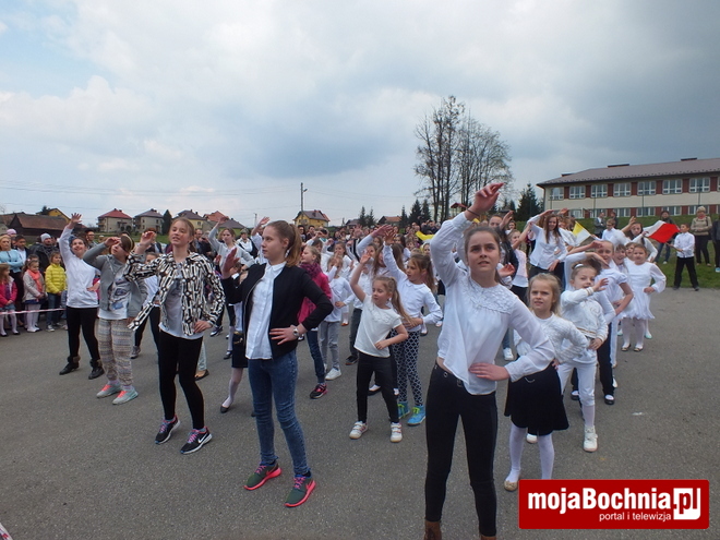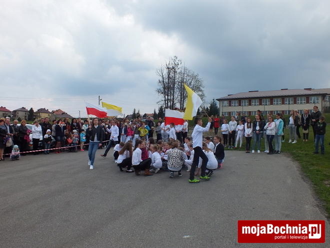 Naszą akcję rozpoczęliśmy w kościele tuż po niedzielnej mszy św. ok. godz. 11.45, śpiewem radosnej piosenki „Kochamy Cię, Janie Pawle II” w wykonaniu dzieci z kl. 3. Następnie prowadzeni przez młodzież niosącą flagę papieską udaliśmy się na parking przy kościele, gdzie ks. Marek Wielgosz cytując fragmenty z „Dzienniczku” św. s. Faustyny, przypomniał jakie znaczenie dla ludzi i całego świata ma Boże Miłosierdzie. Zaznaczył, że chwalić Jezusa Miłosiernego możemy także poprzez taką formę modlitwy ciała, jaką jest śpiew i taniec – mówi Danuta Cybura z ZSG w Łapczycy, pomysłodawczyni przedsięwzięcia.