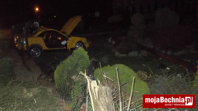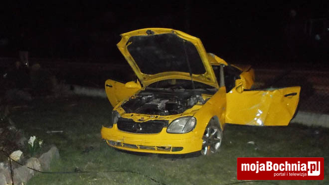 Do zdarzenia doszło w nocy z piątku na sobotę (godz. 23:33) na ul. Krzeczowskiej w Bochni. 19-letni mieszkaniec Bochni, kierujący samochodem marki Mercedes SKL 200, pokonując prawoskrętny łuk drogi stracił panowanie nad pojazdem, zjechał z drogi na brukowany chodnik, a następnie w ogrodzenie posesji uszkadzając je, po czym uderzył w słup trakcji telefonicznej, który w wyniku uderzenia złamał się. Kierujący oraz pasażer samochodu zostali przewiezieni do szpitala w Bochni. Pasażer doznał obrażeń w postaci ogólnych potłuczeń ciała, natomiast kierowca – urazu głowy i kręgosłupa (pozostał w szpitalu na dalsze leczenie).