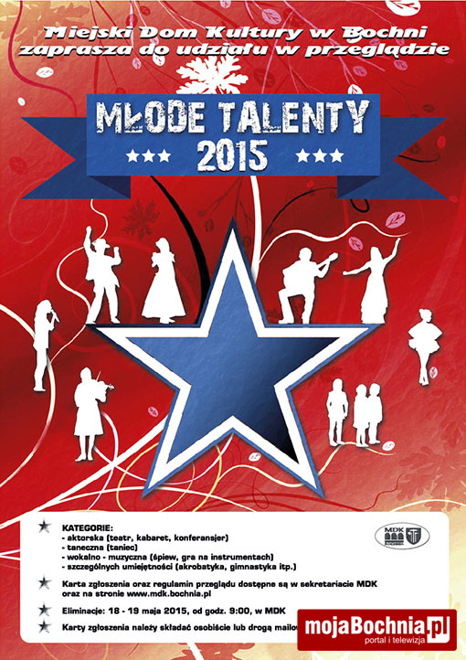 Tylko do piątku 8 maja można zgłaszać swój udział w przeglądzie „Młode Talenty 2015”. Przesłuchania wszystkich zgłoszonych uczestników (na podstawie prawidłowo wypełnionej karty zgłoszeń) i wyłonienie laureatów tytułu Młody Talent 2015 odbędą się w dniach 18 i 19 maja 2015 r., w Miejskim Domu Kultury w Bochni, od godziny 9.00.