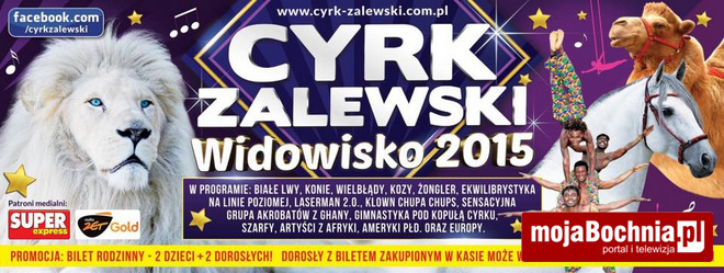 Dla Czytelników mojaBochnia.pl mamy cztery wejściówki na spektakl Cyrku Zalewski (osoba dorosła + dziecko do lat 10). Wystarczy polubić profile mojaBochnia.pl oraz Cyrku Zalewski na Facebooku i wysłać zgłoszenia na adres redakcja@mojabochnia.pl. Prosimy o podpisywanie się imieniem i nazwiskiem. Czas: do godz. 14.00.