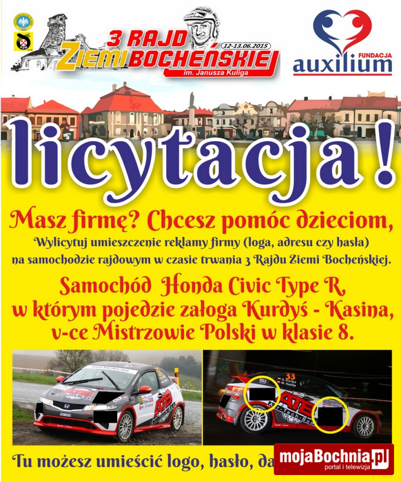 Masz firmę? Chcesz pomóc dzieciom, Wylicytuj umieszczenie reklamy firmy (loga, adresu czy hasła) na samochodzie rajdowym w czasie trwania 3. Rajdu Ziemi Bocheńskiej.