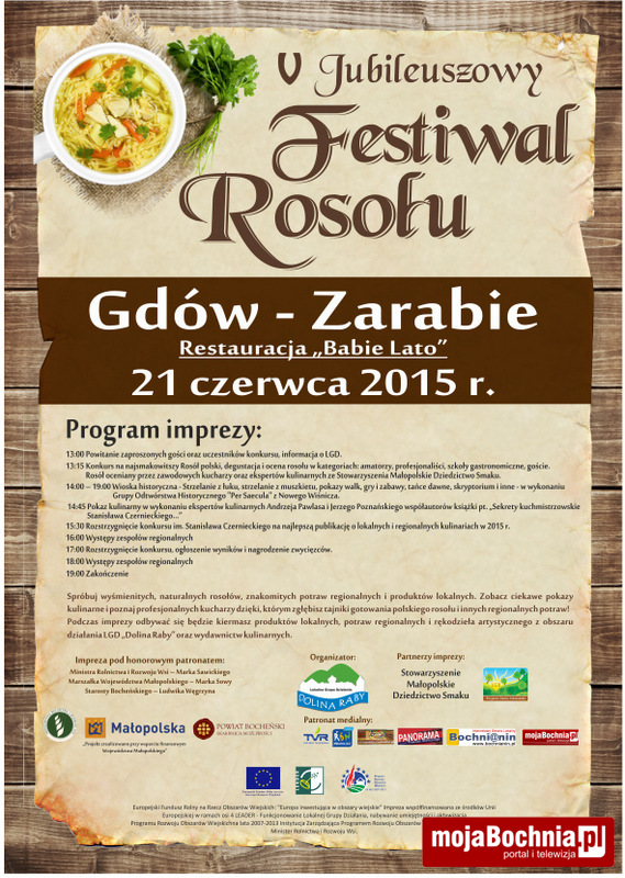 W niedzielę 21 czerwca w Gdowie odbędzie się V Festiwal Rosołu. W programie m.in. konkurs najsmakowitszy rosół polski, pokaz kulinarny, rozstrzygnięcie dwóch konkursów, występy. Organizatorem jest Lokalna Grupa Działania „Dolina Raby” przy udziale Stowarzyszenia Małopolskie Dziedzictwo Smaku. Patronat honorowy objęli minister rolnictwa, marszałek Małopolski oraz starosta bocheński.