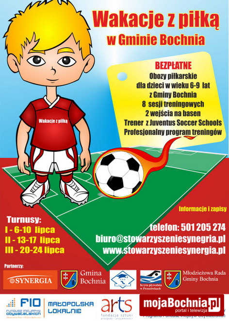 Regionalne Centrum Wspierania Inicjatyw Społecznych „Synergia” i Wójt Gminy Bochnia zapraszają chłopców w wieku 6-9 lat, mieszkających w gminie Bochnia, do udziału w letnich obozach piłkarskich „Wakacje z piłką”.
