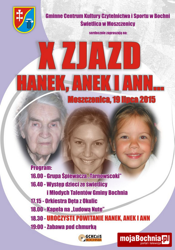 W najbliższą niedzielę 19 lipca w Moszczenicy odbędzie się Jubileuszowy X Zjazd Hanek, Anek i Ann. Mile widziane będą nie tylko imienniczki, ale i pozostali goście dla których przygotowano ciekawy program.