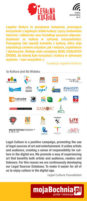 Multimedialna biblioteka od maja krąży po całej Polsce. Łącznie odwiedzi 48 miejsc i 14 festiwali, podczas których posiadacze smartfonów, tabletów i użytkownicy Internetu poznają bogactwo legalnych źródeł w sieci oraz będą mogli pobrać interesujące ich utwory – muzykę, gry, książki, filmy, a także zasoby dotyczące historii Polski. Umożliwią to skrócone linki gotowe do wpisania w przeglądarkę internetową i kody QR oraz dostępna non-stop darmowa sieć wi-fi. Nigdy nie jest za wcześnie i nigdy nie jest za późno, żeby wyrobić w sobie nawyk sięgania po kulturę z legalnych źródeł.