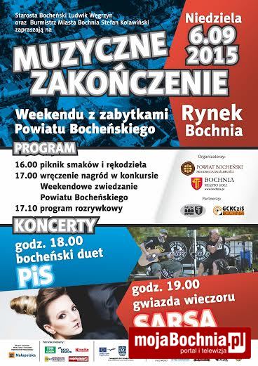 Już w najbliższą niedzielę w Bochni odbędzie się muzyczne zakończenie Weekendu z zabytkami Powiatu Bocheńskiego. Na Rynku wystąpi bocheński duet PiS oraz wschodząca gwiazda SARSA. Odbędzie się także piknik smaków i rękodzieła lokalnych artystów.