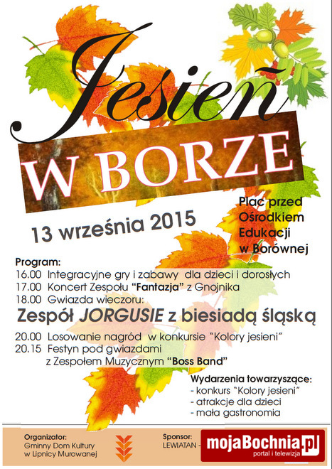 13 września w Borównej w gm. Lipnica Murowana odbędzie się „Jesieni w Borze”. W programie występy, koncerty oraz konkurs i festyn pod gwiazdami.