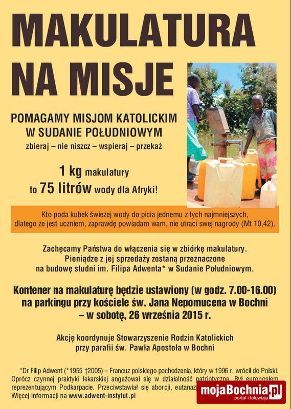 Po wakacyjnej przerwie powraca w Bochni zbiórka makulatury na budowę studni w Sudanie Południowym. Tym razem odbędzie się ona przy kościele św. Jana Nepomucena w najbliższą sobotę 26 września w godz. od 7.00 do 16.00.