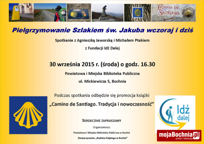 Spotkanie poprowadzą członkowie Fundacji Idź Dalej, propagującej pielgrzymowanie szlakami jakubowymi – Agnieszka Jaworska i Michał Ptak. Na to wydarzenie – połączone dodatkowo z promocją książki „Camino de Santiago. Tradycja i współczesność” – zaprasza Powiatowa i Miejska Biblioteka Publiczna w Bochni oraz Stowarzyszenie Rodzina Kolpinga z Bochni.