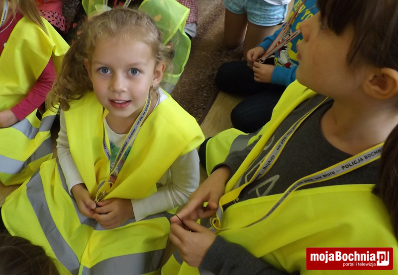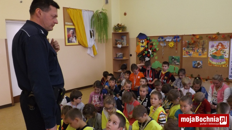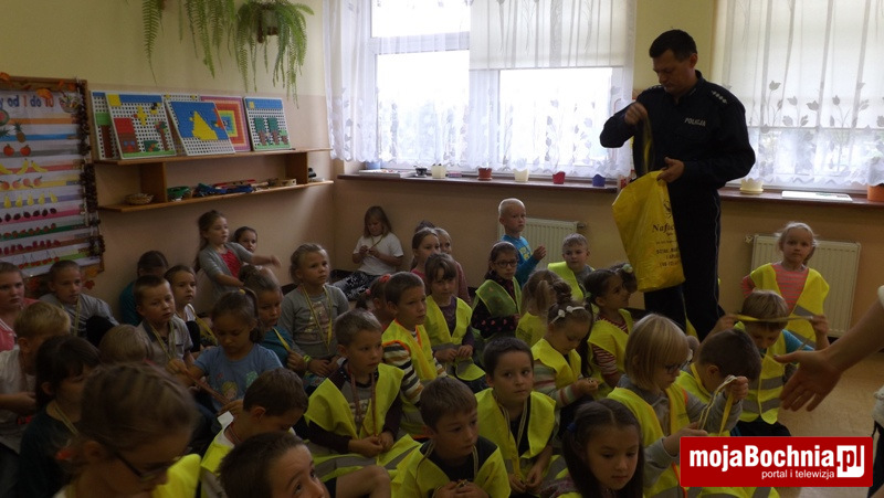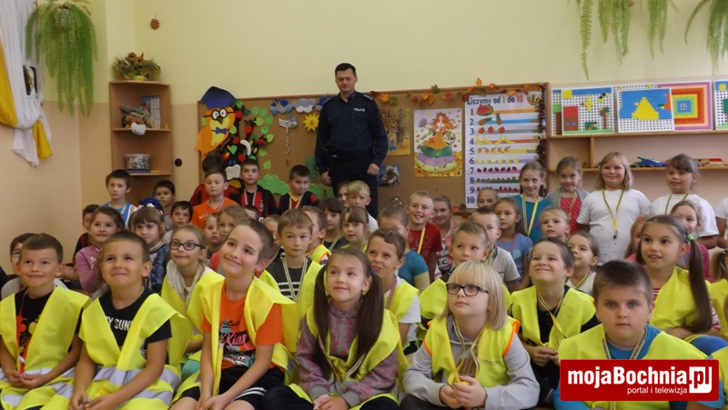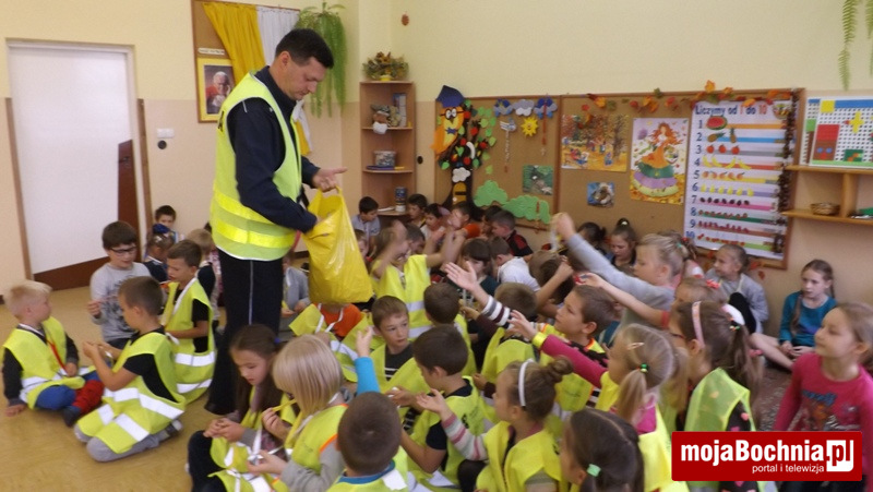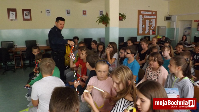 Okres jesienno-zimowy to czas szczególnie niebezpieczny dla pieszych, którzy poruszając się po drogach w godzinach wieczorno-nocnych bez wymaganych przepisami elementów odblaskowych narażeni są na potrącenia przez samochody. Aby zmniejszyć to ryzyko policjanci z Zespołu ds. Nieletnich i Patologii KPP w Bochni podczas spotkań w szkołach w Gminie Drwinia rozdają dzieciom odblaskowe smycze przypominając podstawowe zasady bezpieczeństwa. Na smyczach widnieje hasło „Dziękuję … nie piję, nie palę, nie biorę” nawiązujące do programu profilaktycznego sfinansowanego ze środków Gminnej Komisji Rozwiązywania Problemów Alkoholowych w Drwini.