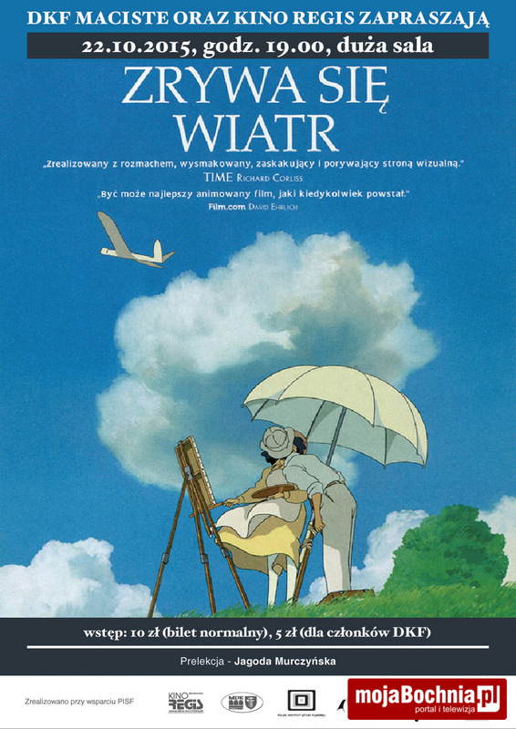 Kolejne spotkanie Dyskusyjnego Klubu Filmowego „Maciste” dzisiaj o godz. 19.00. Tym razem zostanie wyświetlone dzieło najwybitniejszego twórcy filmów anime – Hayao Miyazakim i jego ostatni obraz „Zrywa się wiatr”.