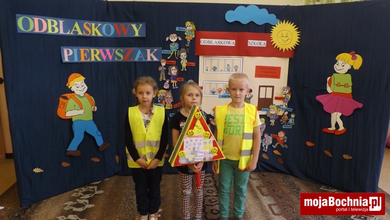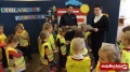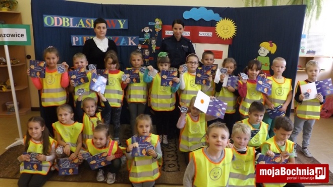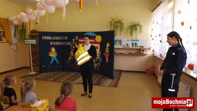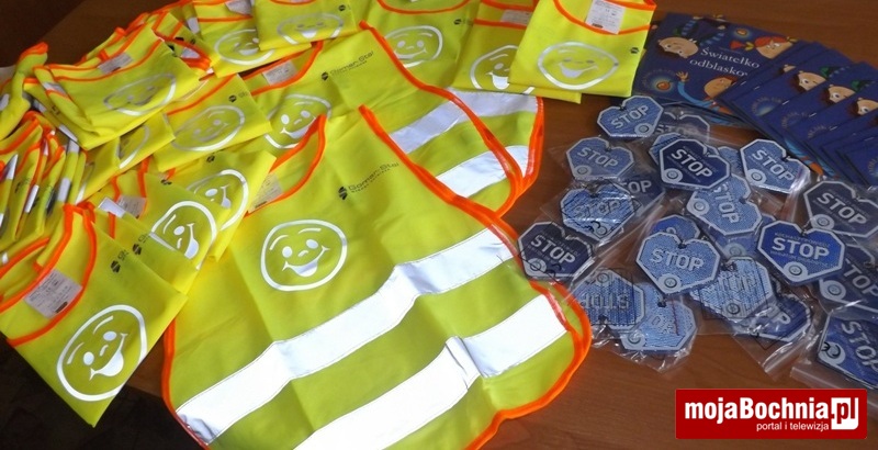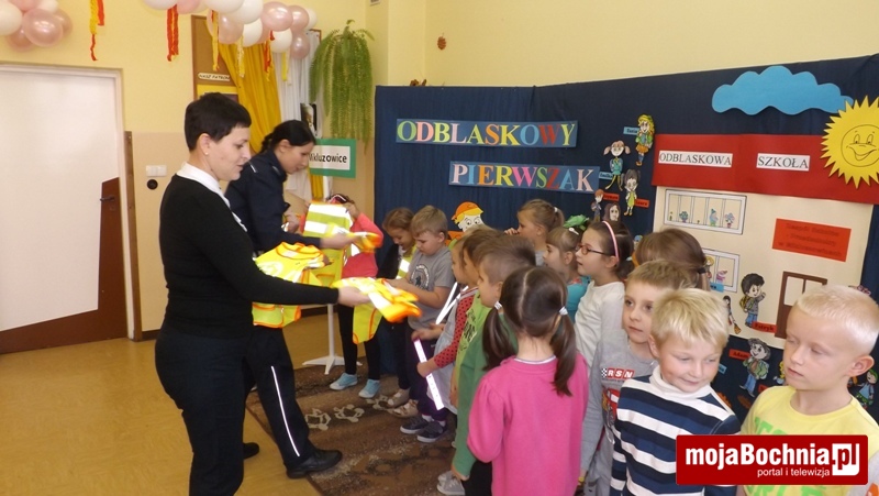 Na zakończenie spotkania uczniowie kl. I otrzymali od Dyrekcji szkoły kamizelki odblaskowe ufundowane przez firmę Gomar-Stal, kolorowy odblask od firmy PZU, a od szkolnego koordynatora akcji – barwne książeczki dotyczące bezpieczeństwa pt. „Światełko odblaskowe” z dodatkowym odblaskiem. Na koniec uczniowie zaśpiewali wspólnie piosenkę o bezpiecznych zachowaniach na drodze, która towarzyszy im od początku akcji. To była bardzo ciekawa i pouczająca lekcja bezpieczeństwa.