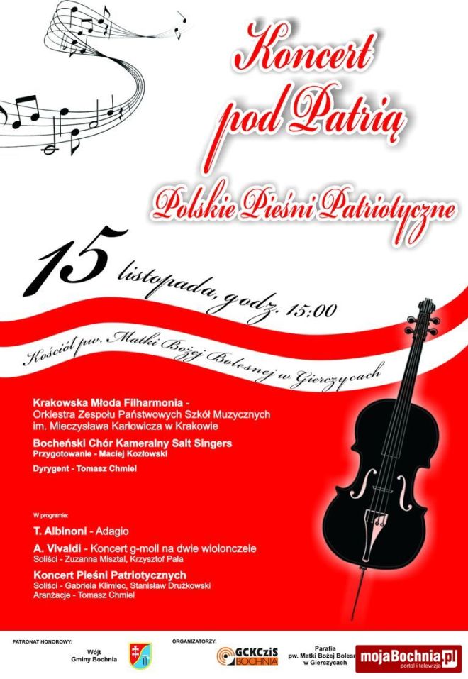 Gminne Centrum Kultury Czytelnictwa i Sportu w Bochni zaprasza na „Koncert pod Patrią. Polskie Pieśni Patriotyczne”, który odbędzie się w niedzielę, 15 listopada o godzinie 15.00 w kościele pw. Matki Bożej Bolesnej w Gierczycach.