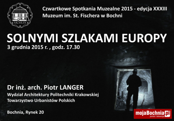 Muzeum im. Stanisława Fischera w Bochni zaprasza na Czwartkowe Spotkanie Muzealne. Dr inż. arch. Piotr Langer (Wydział Architektury Politechniki Krakowskiej, Towarzystwo Urbanistów Polskich) wygłosi wykład pt. „Solnymi szlakami Europy”.