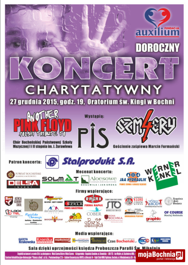 W niedzielę 27 grudnia o 19.00 odbędzie się w Bochni drugi Doroczny Koncert Charytatywny Fundacji Auxilium. Wystąpią dwa tribute bandy: Another Pink Floyd i 4Szmery. Dochód z imprezy zostanie przeznaczony na pomoc 12 podopiecznym Fundacji.