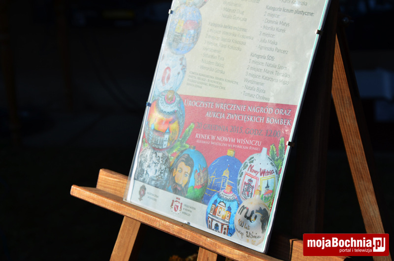 Na zakończenie kiermaszu odbyło się wręczenie nagród laureatom konkursu na najładniejszą bombkę choinkową z akcentem wiśnickim 400-lecie Wiśnicza oraz aukcja bombek choinkowych, które zostały nagrodzone. Stoiska przygotowali: Koła Gospodyń Wiejskich z Muchówki, Kobyla, Wiśnicza Małego, Olchawy oraz Miejski Ośrodek Kultury i Świetlice Wiejskie, Środowiskowy Dom Samopomocy z Muchówki, Muzeum Ziemi Wiśnickiej, Zespół Szkół w Kobylu i Nowym Wiśniczu, Winnica Chronów, Szkółka Krzewów Ozdobnych “Iglaki”, Stawy w Olchawie.