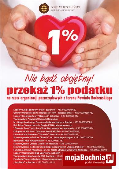 Rozpoczął się czas rozliczeń podatkowych. Niemal wszyscy już wiemy, że jedną setną swojego podatku możemy przekazać wybranej organizacji. Chociaż ostateczny termin przypada na 30 kwietnia, może warto już dziś pomyśleć o rozliczeniu i wsparciu opp. Starostwo zachęca do wsparcia stowarzyszeń z terenu powiatu bocheńskiego.